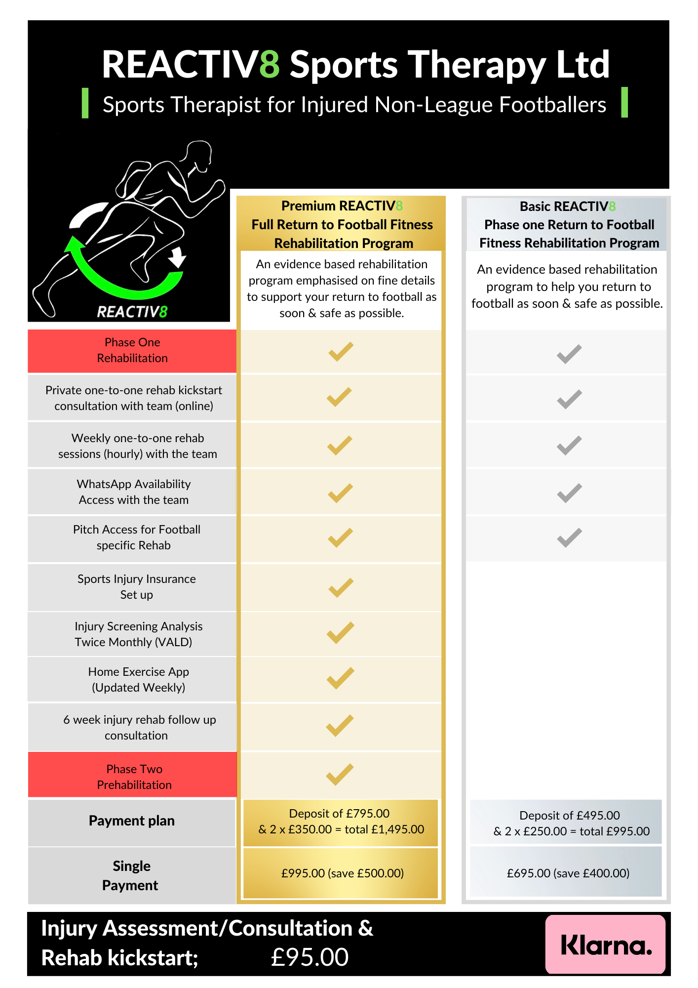 The rehabilitation program is personalised & specific to you & the phase of your injury. This is monitored weekly & progressed gradually to challenge you further & most importantly get you back playing football as soon & safe as possible.